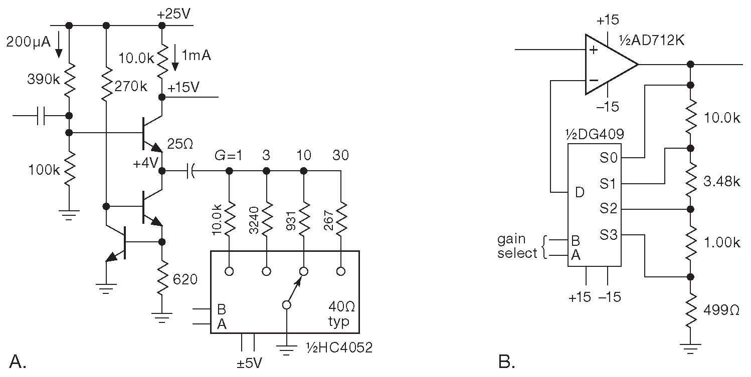 Рис. 3.84 (A) Выбор резистора установки усиления в схеме с эмиттерной дегенерацией с использованием мультиплексора. (B) Аналогичная схема с операционным усилителем, о которых повествует Часть _4