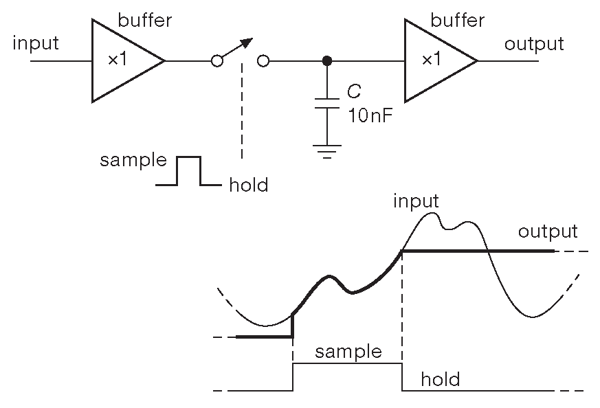 Схему выборки-хранения можно существенно улучшить, если охватить её обратной связью, как это делается в §4.5.2 . На самом деле, есть законченные интегральные схемы. Например, AD783 уже имеет внутри конденсатор хранения, устанавливает выход с точностью 0.01% за 0.25 μs , а потенциал на конденсаторе хранения снижается со скоростью <0.02 μV/μs . Приятно, когда кто-то делает работу за тебя!