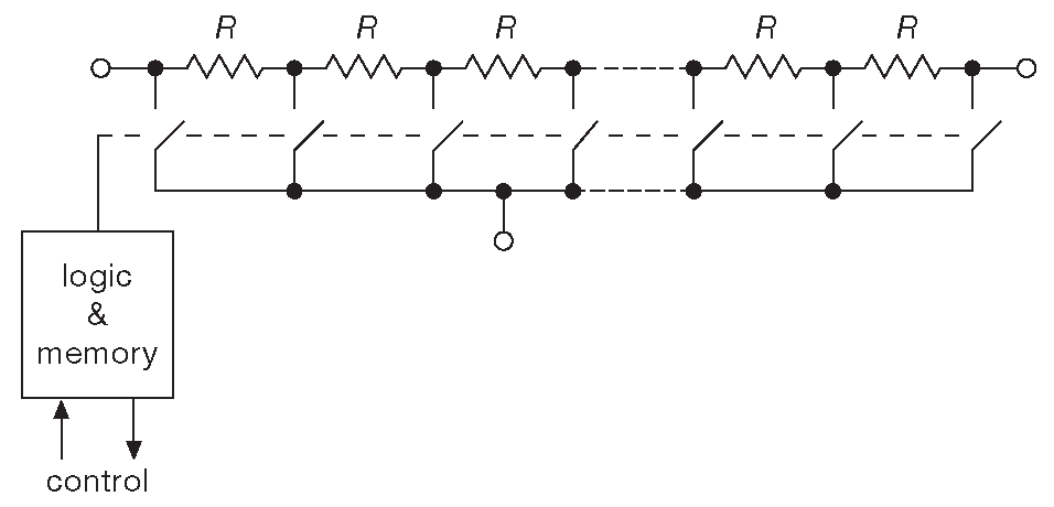 Рис. 3.87 ИМС «цифрового потенциометра». Внутренняя цифровая логика выбирает один из n ключей, подсоединяя к выходу один из отводов цепочки из n-1 резисторов