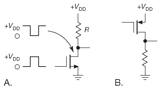 На рис. 3.88 показаны простейшие варианты логических ключей. Обе схемы используют в качестве нагрузки резистор и выполняют логическую функцию, называемую «инверсия»: входной ВЫСОКИЙ уровень вызывает появление НИЗКОГО состояния на выходе и наоборот. n-канальный вариант замыкает выход на землю, когда на затворе ВЫСОКИЙ уровень, а p-канальный подтягивает резистор к положительной шине, когда на затворе НИЗКИЙ уровень. Отметим, что МОП транзисторы в этих схемах используются в качестве усилителей с общим истоком, а не истоковых повторителей. От цифровых логических схем, подобных показанным, обычно требуется некоторое выходное напряжение ( «логический уровень» ), соответствующий определённому входному напряжению. Резистор здесь работает пассивной стоковой нагрузкой, подтягивая выход к нужному уровню питания, когда транзистор выключен. Его можно заменить лампочкой, реле, иголкой в головке принтера или какой-нибудь мощной нагрузкой, как в схеме 3.3 . Хотя при управлении мощной нагрузкой используется тот же инвертор, его задача чуть иная: включать и выключать потребителя.