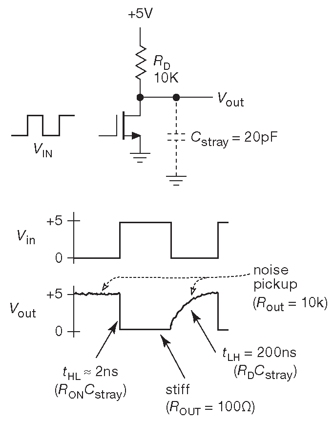 Рис. 3.89 Высокий выходной импеданс выключенного n-МОП инвертора затягивает время возрастающего фронта и подвержен воздействию шума от емкостных наводок