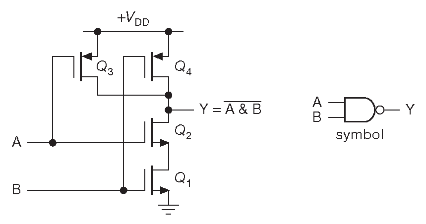 Цифровые КМОП схемы разбираются в материале, посвященном логическим схемам и процессорам ( Части 10 и далее ). На данный момент понятно, что КМОП - молопотребляющие схемы с нулевым током покоя, высокоимпедансным входом и низкоомным выходом, переключающиеся между уровнями питания. Но трудно удержаться от того, чтобы не показать ещё одну КМОП схему ( рис. 3.91 ). Это логический вентиль «И-НЕ». Его выход переходит в НИЗКОЕ состояние, только когда на входе «A» И на входе «B» одновременно ВЫСОКИЙ уровень. Принцип работы понять неожиданно легко. Если «A» и «B» оба ВЫСОКИЕ, последовательные n-МОП транзисторы \(Q_1\) и \(Q_2\) находятся во ВКЛЮЧЁННОМ состоянии и замыкают выход на землю, а p-МОП \(Q_3\) и \(Q_4\) ВЫКЛЮЧЕНЫ, т.е. ток через них не течёт. Но если на «A» ИЛИ «B» ( или на обоих разом ) НИЗКИЙ уровень, то соответствующий p-МОП транзистор включается, а n-МОП выключается. В результате ток через последовательное соединение \(Q_1Q_2\) не течёт, а \(Q_3\) или \(Q_4\) ( или оба ) подтягивают выход к ВЫСОКОМУ уровню.