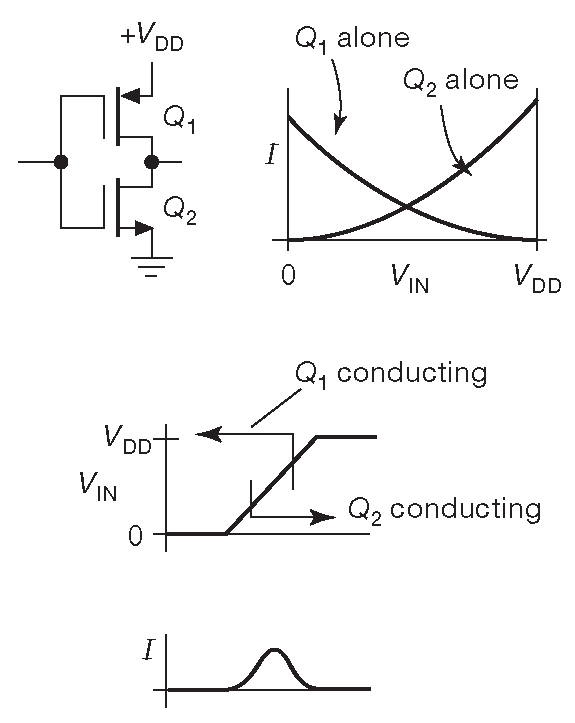 Рис. 3.93 Когда напряжение на затворе КМОП инвертора занимает промежуточное положение между \(V_{DD}\) и землёй, оба МОП транзистора чуть приоткрываются, и через них начинает течь сквозной ток ( это режим «класса-A» )