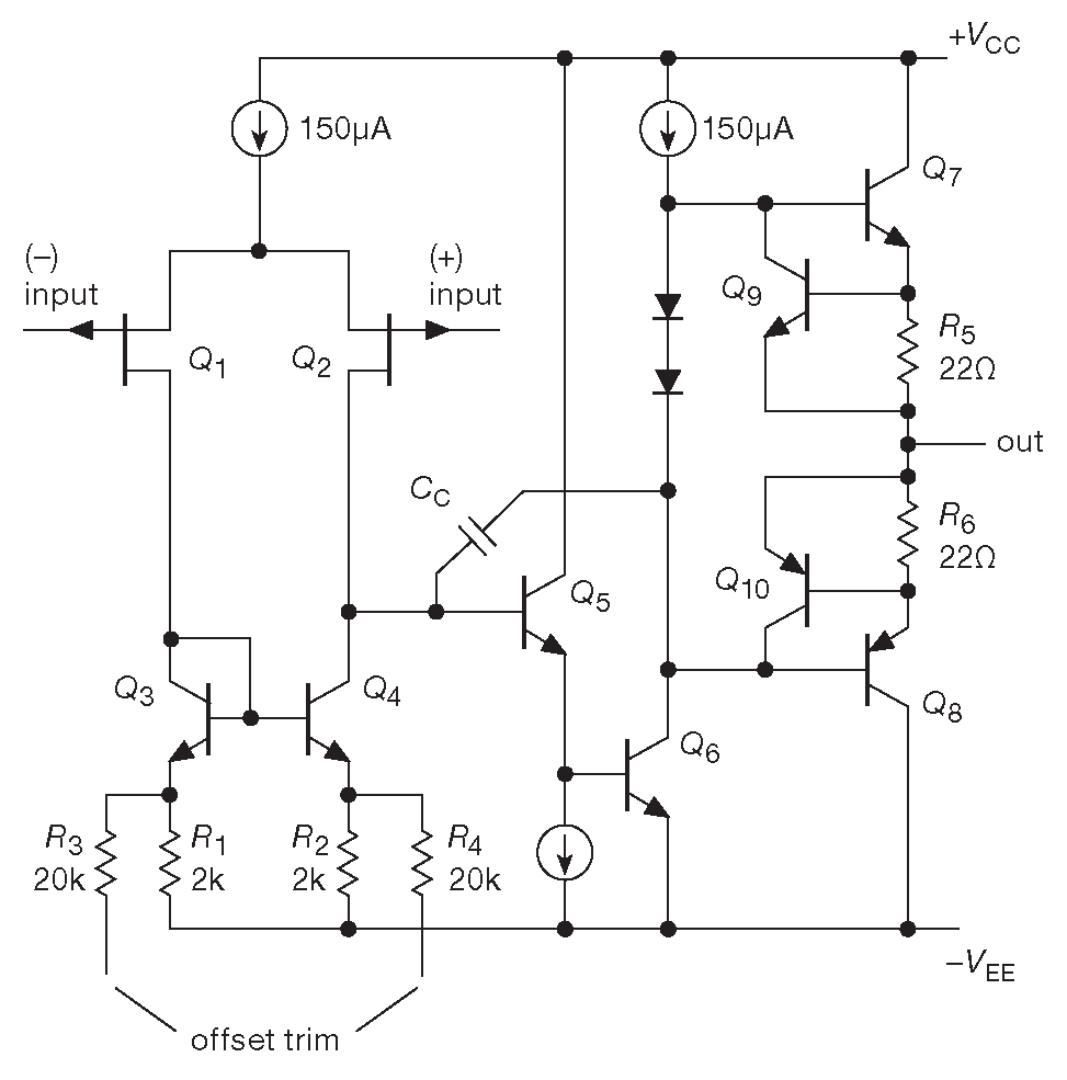 Начнём с рассмотрения рис. 4.43 - упрощённой схемы ОУ LF411. Схема достаточно несложная и сильно напоминает транзисторные варианты, разбиравшиеся в предыдущих двух частях книги. На входе стоит дифференциальный каскад на ПТ с активной нагрузкой в виде токового зеркала. Далее сигнал подаётся на npn повторитель \(Q_5\) , работающий на усилитель с общим эмиттером \(Q_6\) ( с активной нагрузкой в виде источника тока ). \(Q_5Q_6\) позволяют отделить входной каскад с большим усилением от усилителя мощности \(Q_7Q_8\) с токоограничивающей схемой на \(R_5Q_9\) и \(R_6Q_{10}\) 19 . Странно расположенный конденсатор обратной связи \( C_C\) обеспечивает устойчивость, о чём будет разговор дальше. Схема имеет параметры типового ОУ и поможет разобраться, где именно возникают отклонения от идеальной модели.