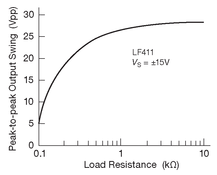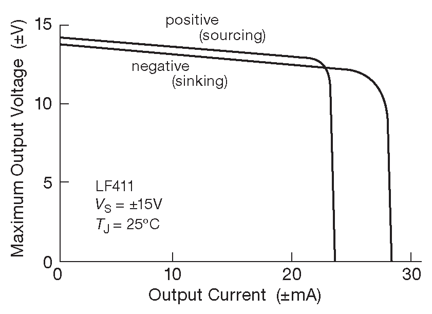 Для низкоомной нагрузки максимальный размах сигнала определяется схемой ограничения тока. Например, если сопротивление нагрузки больше 1 kΩ , выходной сигнал будет не доходить по 2V до \( V_{CC}\) и \( V_{EE}\) , но если сопротивление нагрузки существенно ниже, то и амплитуда будет гораздо меньше. Такая реакция на изменение нагрузки часто отражается в справочных данных в виде графика амплитудного значения выходного напряжения, как функции сопротивления нагрузки , или в виде нескольких отдельных цифр для её характерных значений. На рис. 4.44 показан такой график для LF411. Многие ОУ имеют асимметричные выходные каскады и отдают больше тока, чем могут принять ( или наоборот ). В этом случае на графике можно обнаружить две кривые: одну для отдаваемого, другую для принимаемого тока ( рис. 4.45 ).