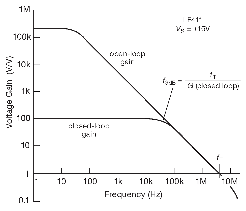 Усиление по напряжению типового ОУ \( A_{vo}\) ( оно же \( A_{VOL}\) , \( A_V\) , \( G_V\) и \( G_{VOL}\) ) на постоянном токе составляет 100'000 или 1'000'000 и падает до единицы на некоторой частоте, называемой \( f_T \) или GBW ( произведение усиления на полосу ). Чтобы избавиться от множества нулей цифры часто выражают в децибелах: здесь 100 dB и 120 dB . \( f_T \) обычных ОУ лежит в диапазоне от 100 kHz до 10 MHz . Все эти значения приводят в виде графика зависимости усиления без обратной связи от частоты, на котором \( f_T \) - это точка пересечения графика с горизонтальной осью. На рис. 4.47 показана картина для любимого LF411.