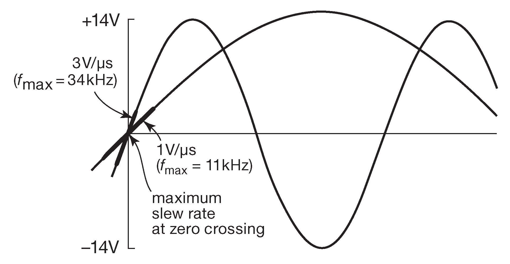 Рис. 4.48 Максимальная скорость нарастания для синусоидального сигнала \( SR=2πAf\) достигается в точке перехода через ноль