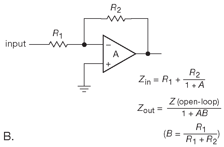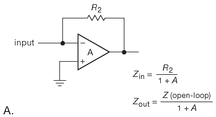Инвертирующий усилитель отличается от неинвертирующего и требует отдельного анализа. Удобнее всего представлять его в виде комбинации из входного резистора, который подключён к каскаду с шунтом в обратной связи ( рис. 4.52A ). Входом каскада с шунтом служит «суммирующая точка» ( инвертирующий вход усилителя ), где складываются токи от обратной связи и входного сигнала. Такую конфигурацию можно назвать «трансрезистивной»: она превращает ток на входе в напряжение на выходе. Обратная связь снижает импеданс \(R_2\) , со стороны суммирующей точки, в 1+A раз ( можете ли вы это доказать? ). Очень высокие значения петлевого усиления сокращают входной импеданс до долей ома, что для схемы с токовым входом - отличная характеристика.