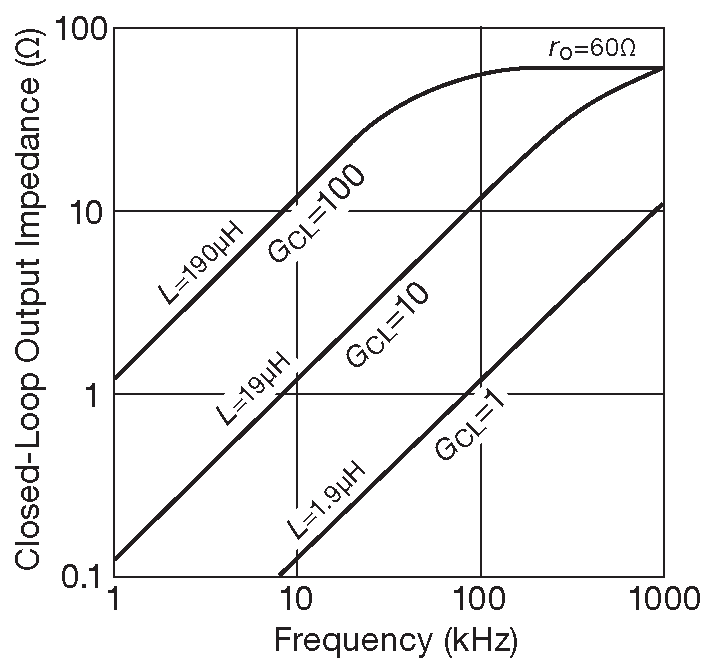 Линейный рост выходного импеданса с обратной связью иллюстрирует рис. 4.53 , взятый из справочных данных на LT1055. Можно видеть, что большее петлевое усиление снижает выходное сопротивление ( обратная связь построена так, чтобы общее усиление схемы было небольшим ). Это сопротивление затем плавно растёт до исходного \(R_{out}\) ( иногда обозначаемого \( r_o\) - выходного сопротивления с разомкнутой петлёй ), здесь 60 Ω . Стоит отметить, что выходной импеданс схемы с обратной связью ведёт себя подобно индуктивности ( линейно растёт с частотой ), т.е. именно так ведёт себя выходной сигнал [* и становится очевидно, что термин «выходное сопротивление» некорректен] . Данное положение имеет важные следствия, например, появление последовательных резонансных LC цепей, когда на выходе ОУ висит емкостная нагрузка.