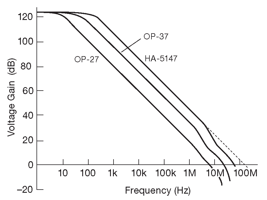 Начнём тему с рассмотрения зависимости усиления от частоты для нескольких ОУ. Типичная картина выглядит как на рис. 4.95 . Беглый взгляд на диаграмму Боде ( график зависимости усиления и фазы без обратной связи от частоты в лог-лог координатах ) можно заключить, что OP27 здесь - самый слабый участник, т.к. именно его усиление начинает падать с частотой раньше других. Сам спад усиления встроен в схему любого операционного усилителя и аналогичен спаду в 6 dB/octave обычного RC фильтра нижних частот. OP37 идентичен OP27 во всём, кроме одного: это частично корректированный усилитель. То же можно сказать и о снятом с производства HA-5147 42 . Большая часть операционных усилителей имеют внутренние цепи коррекции, но бывают доступны и частично корректированные и некорректированные варианты. Разберём частотную коррекцию подробнее.