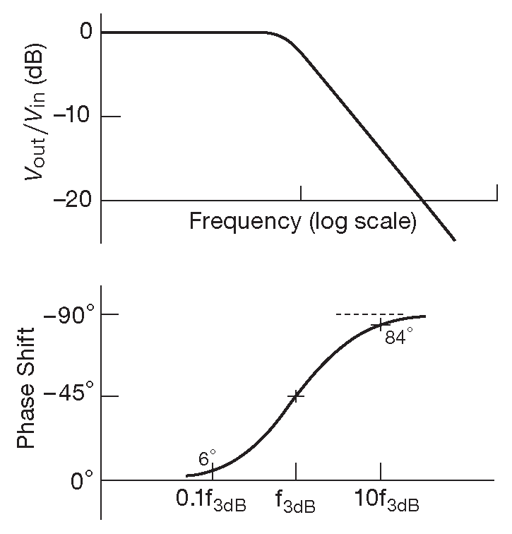 Снижение реактивного сопротивления конденсатора с ростом частоты вызывает появление на характеристике спада 6 dB/octave . На некоторой частоте, которая может быть меньше 1 kHz , реактивное сопротивление ёмкости нагрузки становится меньше импеданса подтяжки в цепи коллектора. Это приводит к спаду усиления \( G_V=g_mX_C\) , т.е., усиление падает по закону 1/\( f \). Та же ёмкость вызывает запаздывание фазы выходного сигнала на 90° относительно входного. Данное явление можно рассматривать как хвост на характеристике RC ФНЧ, где \(R\) являет собой эквивалент импеданса источника, подключённого к ёмкости нагрузки. В самой схеме при этом может не быть ни одного резистора.