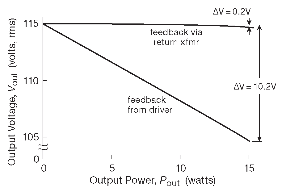 Чтобы получить стабильный выход с малыми искажениями при изменениях нагрузки, нужно брать сигнал обратной связи с выходной линии 115 V . При этом очень желательно сохранить полную гальваническую изоляцию управляющей схемы. Требование выполняется с помощью второго трансформатора \( T_2\) , который создаёт копию выходного напряжения. Сигнал с \( T_2\) возвращается через резистор обратной связи \(R_3\) на ОУ, обеспечивая нужное усиление \( G\)=6 . На больших частотах трансформаторы вносят очень большой сдвиг фаз, поэтому схема построена так, чтобы на частотах выше ∼3 kHz обратная связь шла через \( C_1 \) с первичной обмотки силового трансформатора. Но, даже когда высокочастотная обратная связь берётся с выхода эмиттерного повторителя, остаётся сдвиг фаз, вызванный реактивным характером нагрузки ( первичная обмотка трансформатора, мотор и т.п. ). Для обеспечения устойчивости с реактивной нагрузкой на линии 115 V операционный усилитель требует перекомпенсации с помощью небольшого конденсатора, благо в LT1097 имеется вывод, позволяющий это сделать. Потеря рабочей полосы в результате этих манипуляций не важна, т.к. устройство изначально низкочастотное.