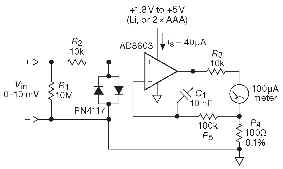 Сделаем работу интереснее, добавив некоторые ограничения. В настоящий момент задача заключается в создании вольтметра с диапазоном измерения 0...10 mV , работающего от источника +3V ( литиевая батарея или два щелочных элемента «AAA» ). Такие параметры требуют, чтобы ОУ был с «однополярным» питанием. Подобные усилители обязаны работать с сигналами вплоть до нуля [* вернее, до потенциала отрицательной шины питания] на входе и выходе. Более того, они должны сохранять работоспособность до полного разряда батареи, т.е. до 0.9—1.0 V на элемент или 1.8 V полного питания схемы. Пусть входное сопротивление будет 10 MΩ , и потребуем, чтобы прибор показывал 0 mV ( ±1% от полной шкалы ), когда вход закорочен или разомкнут. Отметим, что «ошибка нуля» - это не то же самое, что точность полной шкалы ( «ошибка масштабирования» ): ±5% точность полной шкалы [* максимального значения для выбранного диапазона 10 mV , т.е. ±0.5 mV ] будет вполне достаточно, но показания никуда не подключённого прибора на уровне ±0.5 mV совершенно неприемлемы.