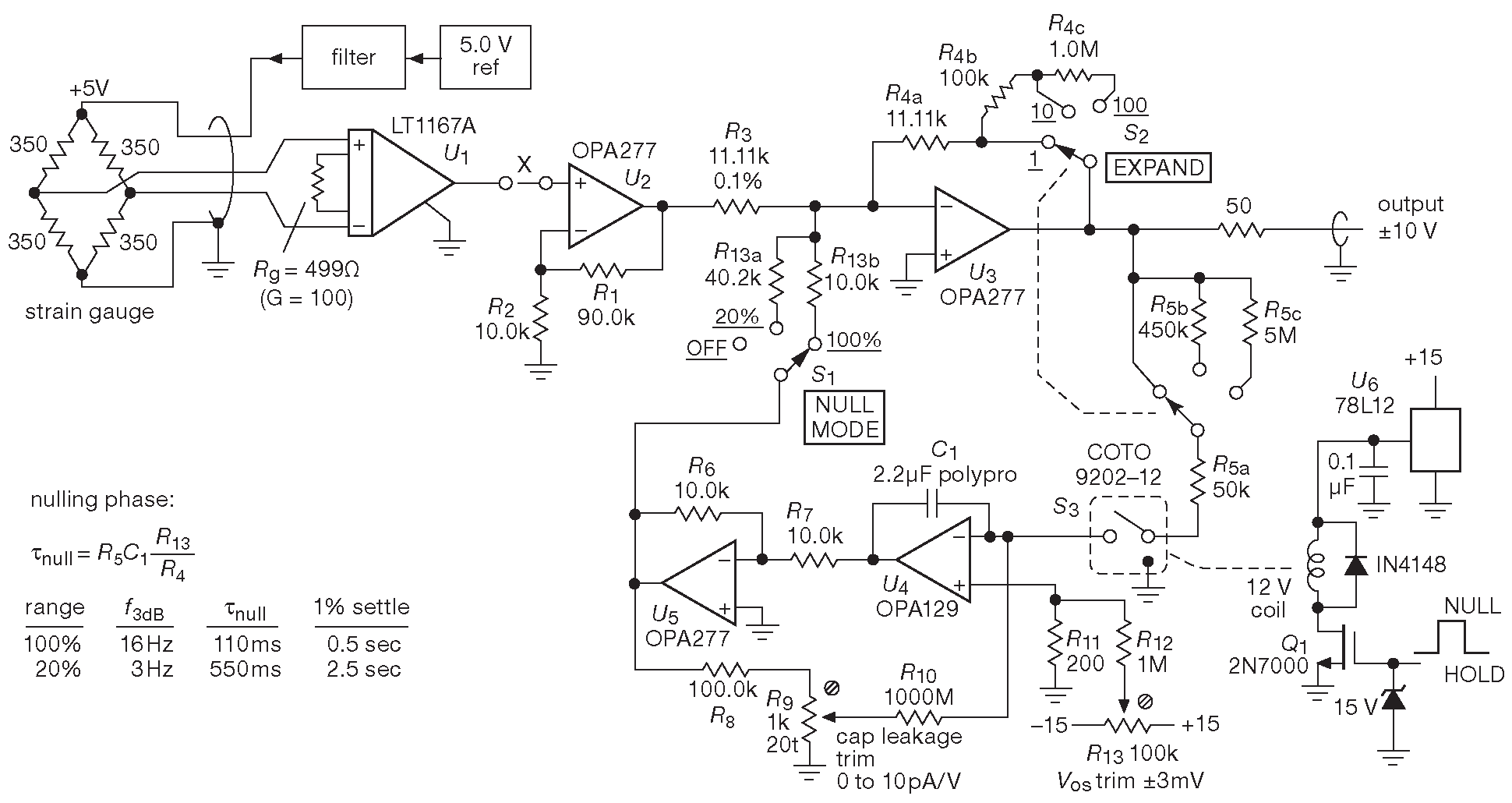 Схема установки нуля работает следующим образом: \(U_3\) в инвертирующем включении создаёт постоянное смещение пропорциональное току, втекающему в суммирующую точку. Если на затвор \(Q_1\) подаётся активный высокий сигнал, значит потенциал на входе принимается за базовый. При этом \(Q_1\) включает реле и замыкает контактную группу \( S_3\) , а \(U_4\) заряжает аналоговую «память» - конденсатор \( C_1 \) - до уровня, необходимого для установки на выходе нулевого напряжения. Схема не пытается отследить быстро меняющееся напряжение, так как предназначена для использования с сигналами постоянного уровня, и способность их дополнительно усреднять очень желательна. Когда ключ \( S_3\) разомкнут, напряжение на \( C_1 \) перестаёт меняться, а на выходе \(U_3\) сигнал начинает отражать отклонение входного напряжения от сохранённого уровня. Чтобы увеличить разрешение системы вблизи базового уровня, можно менять переключателем \( S_2\) значение усиления, при этом, чтобы удержать неизменной рабочую полосу цепи обратной связи, соответственно меняется усиление интегратора базового уровня. Переключатель \( S_1\) устанавливает диапазон базового уровня в долях от полной шкалы ( 100% – 20% – 0 ).