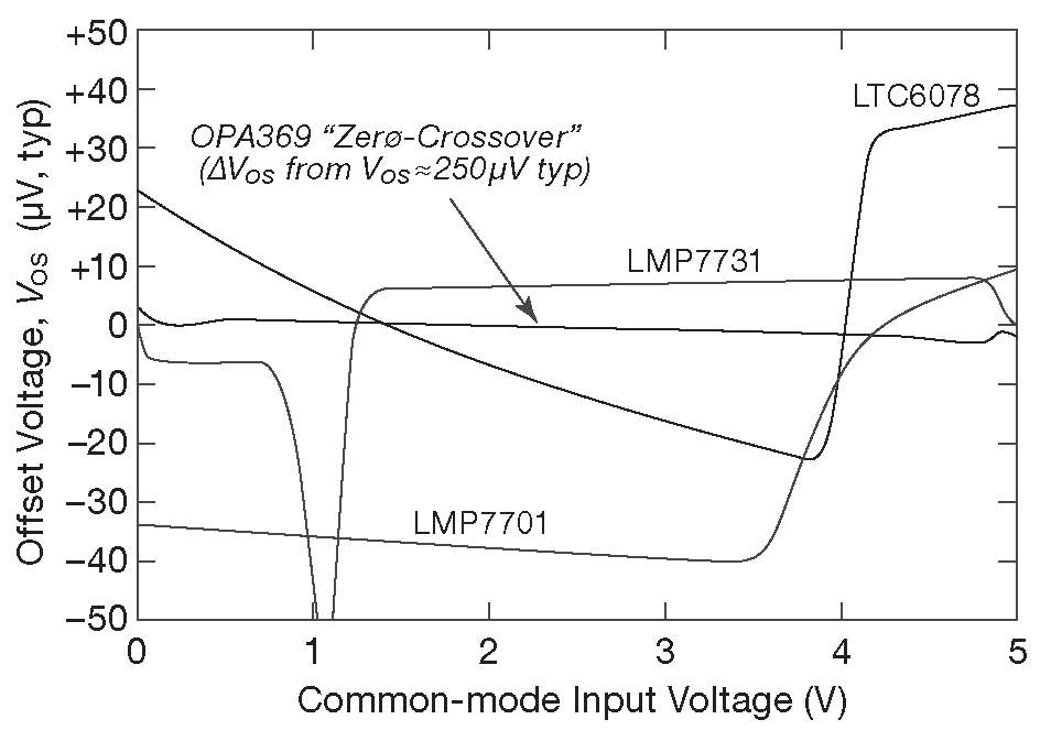 Рис.5.29 В ОУ с RR входами обычно есть сдвиг \( V_{os}\) , проявляющийся, когда входной сигнал переходит от одного дифференциального каскада к другому. OPA369 обходит эту проблему, используя один входной дифференциальный каскад, который подключён к источнику с повышенным напряжением от внутренней схемы накачки