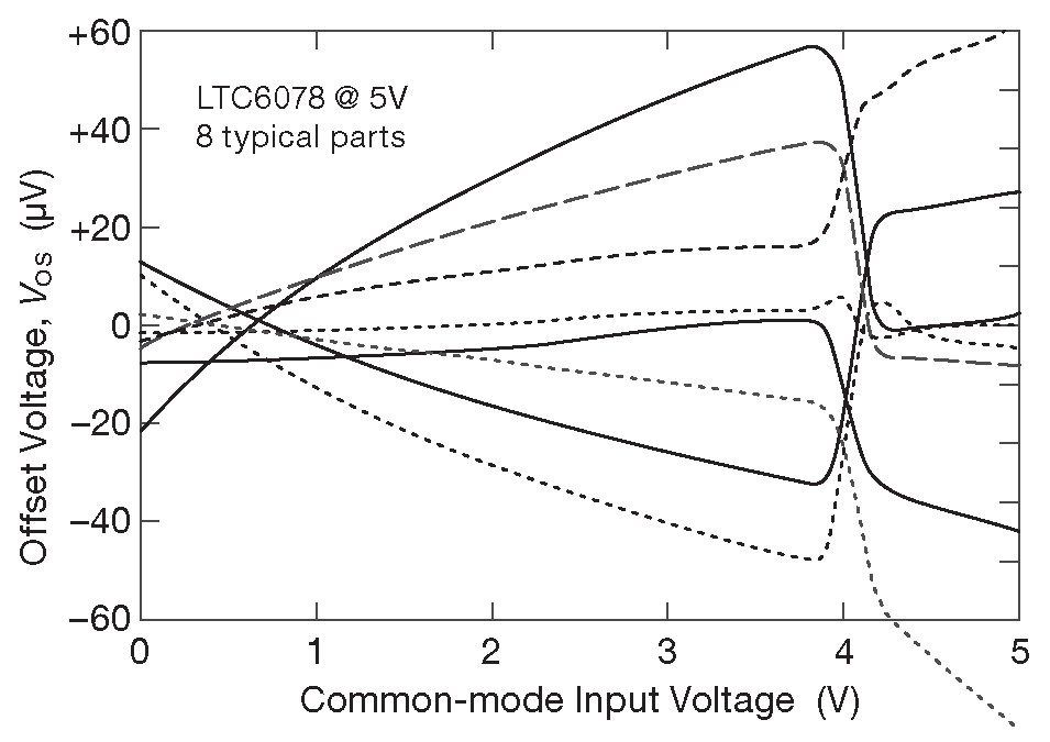 RRI усилители со сдвоенным входным дифференциальным каскадом имеют аналогичные проблемы и со входным напряжением смещения \( V_{os}\) ( рис. 5.29 ). Оно может резко измениться в близи от любого из потенциалов питания, см. графики для LMP7701 и LMP7731, которые были взяты из справочных данных производителя. Обычно такие данные выглядят как мешанина кривых, отражающих параметры нескольких образцов ( если такие данные вообще публикуются ). Самое время сравнить их с простым и скучным поведением \( V_{os}\) для усилителей с единственным входным дифференциальным каскадом и внутренней схемой подкачки питания. Все эти изменения \( V_{os}\) не только нежелательны, но и вдобавок непредсказуемы, как это видно на рис. 5.30 . [* Можно назвать это безобразие «входным каскадом класса B»]