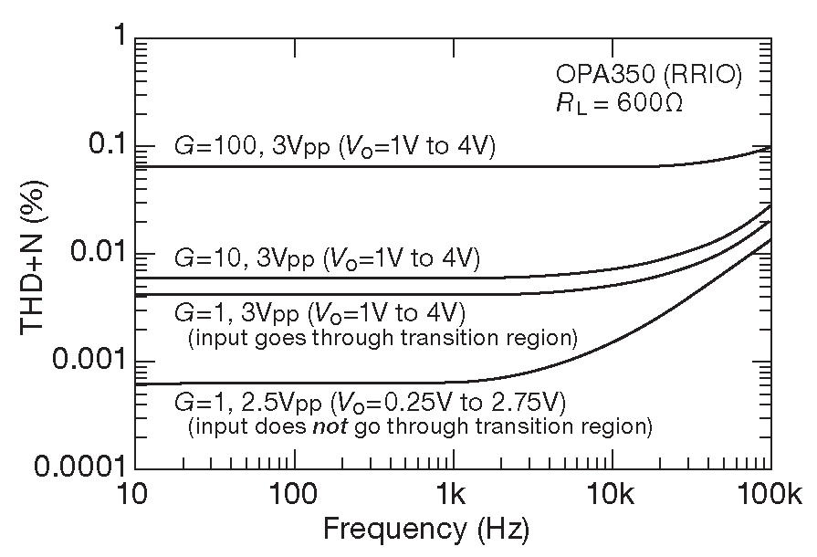 Рис.5.31 Зависимость уровня искажений от частоты для RRIO ОУ OPA350. Видно значительное увеличение искажений при переходе входного сигнала в область инверсии \( V_{os}\) . Увеличение коэффициента усиления с обратной связью только ухудшает ситуацию, потому что снижает петлевое усиление