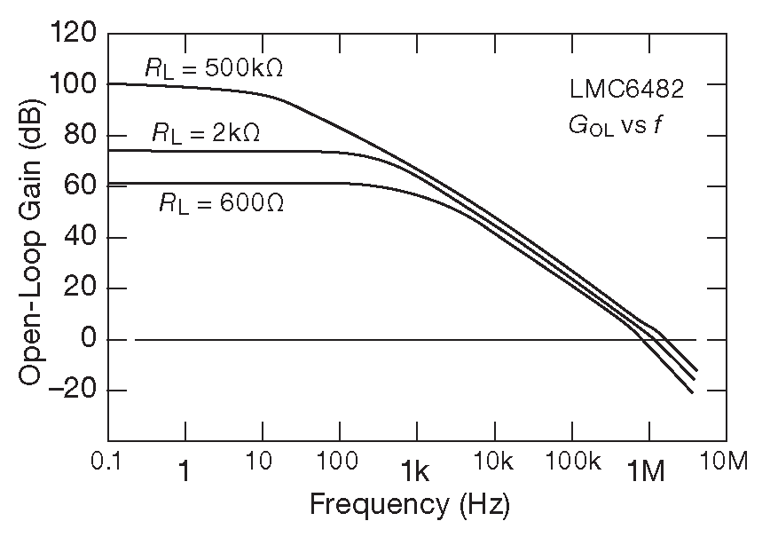 Рис.5.33 Усиление ОУ с RR выходом на низкой частоте может сильно зависеть от сопротивления нагрузки, как это можно наблюдать у LMC6482