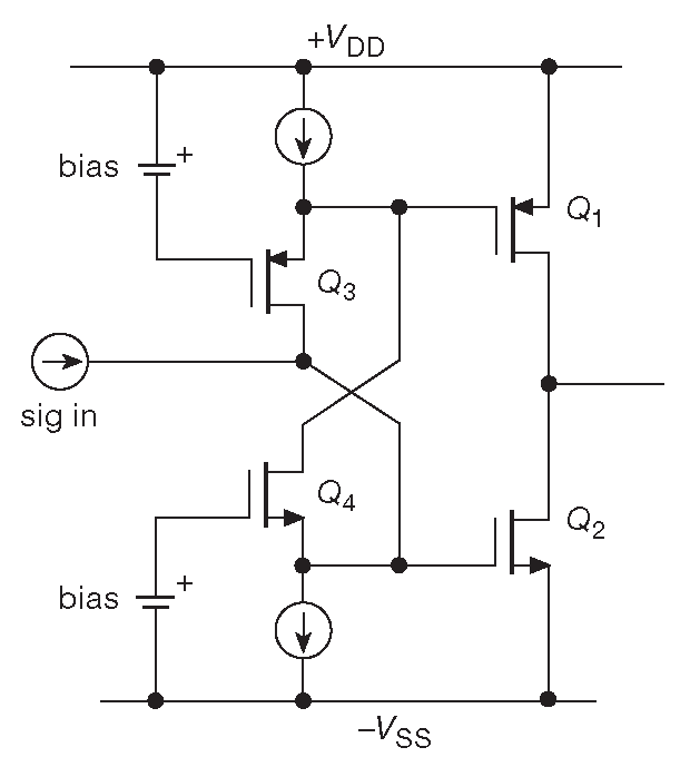 Вот краткое изложение работы схемы: во-первых, будем рассматривать \(Q_3\) и \(Q_4\) как токовые усилители с единичным коэффициентом усиления, выводы истока которых являются «суммирующими узлами» ( т.к. на затворы подаётся постоянное напряжение ). Теперь представим, что ток входного сигнала увеличивается, что снижает общий отвод тока через исток \(Q_4\) . Это уменьшает его \( V_{GS}\) и увеличивает \( V_{GS}\) транзистора \(Q_2\) , что в свою очередь увеличивает ток с выхода в шину –\( V_{SS}\) . При этом снижение тока стока \(Q_4\) вызывает уменьшение отвода тока от истока \(Q_3\) и увеличивает \( V_{GS}\) \(Q_3\) . Это приводит к снижению \( V_{GS}\) \(Q_1\) , а значит, снижению тока от шины +\( V_{SS}\) к выходу. Общий ток покоя устанавливается сквозным током \(Q_3\) и \(Q_4\) . Таким образом, это схема с хорошей самобалансировкой с однополярным токовым входом и симметричным токовым выходом.