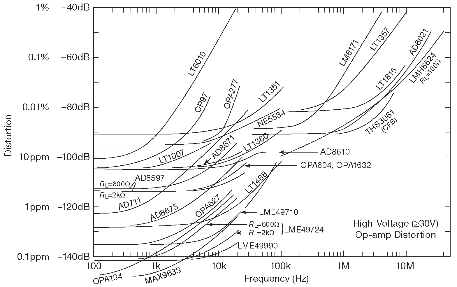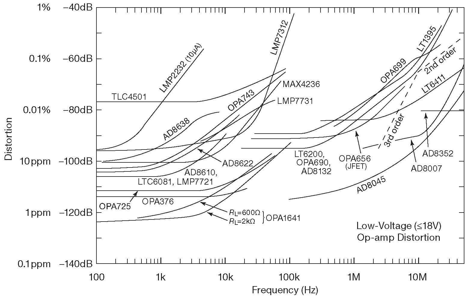 Во-первых, стандарта на искажения ОУ нет, и производители вольны использовать любые условия измерений 44 . Одни используют THD , другие THD+N , третьи указывают уровни конкретных гармоник, например, 2-ой и 3-ей. Эти неочевидные условия влияют на результат.