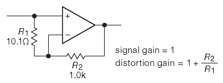 Наконец, взглянем на схему для измерения искажений на уровне меньше 100 ppm ( рис. 5.46 ). Приём заключается в 100-кратном снижении петлевого усиления и увеличения тем самым искажений в 100 раз. Полученная цифра, поделенная на 100 , и есть паспортное значение искажений. Но немедленно возникают мысли об искусственном характере теста, где ОУ видит на входе сигнал с нетипично низким импедансом. Самый безопасный вывод: в этом направлении стоит провести дополнительные исследования 45 .