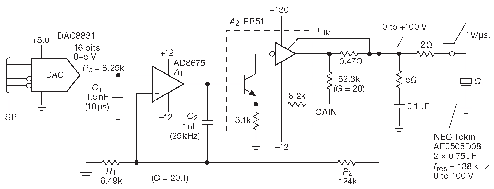 Схема драйвера показана на рис. 5.47 . При проектировании учитывались умеренные требования к скорости 1 V/μs , которые требовали \(I=C·dV/dt\)=1.5 A для ёмкости пьезо-элемента 1.5 μF . Источником сигнала служит DAC8831 ( 16-разрядный ЦАП по схеме «R-2R» с полной шкалой +5V и \(R_{out}\)=6.25 kΩ ) с быстрым интерфейсом SPI. При работе от источника опорного напряжения 5V вес младшего разряда составляет 76 μV . ЦАП требует буферного ОУ со входным током меньше 12 nA , чтобы падение, возникающее на выходном сопротивлении 6.25 kΩ , не превышало единицы младшего разряда. При этом усилитель должен выдавать сигнал 100 V на нагрузке 1.5 μF .