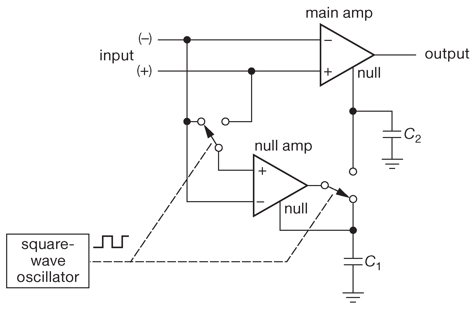 Даже самые лучшие из точных ОУ с малым \( V_{os}\) не могут сравниться по этому параметру с моделями, которые называют «стабилизированные прерыванием» и «с автоподстройкой нуля», а иногда - «с нулевым дрейфом». Самое смешное, что эти очень интересные усилители построены по КМОП технологии и знамениты своей заурядностью во всём, что не касается напряжения смещения нуля и его дрейфа. Хитрость в том, что на кристалле есть дополнительный операционный усилитель, занятый поддержанием нуля основного ОУ ( плюс некоторое количество ключей и конденсаторов, хранящих напряжение ошибки ). Одна из возможных конфигураций показана на рис. 5.48 . Один ОУ работает в качестве основного неидеального усилителя. Задачей вспомогательной схемы является наблюдение за его входным смещением и подстройка медленного сигнала коррекции, выводящего указанное смещение в ноль. Из-за того, что у вспомогательного ОУ есть собственное смещение, в работе схемы есть цикл самокоррекции. Оба усилителя имеют третий «зануляющий» вывод, аналогичный выводу подстройки смещения, имеющемуся в некоторых ОУ.