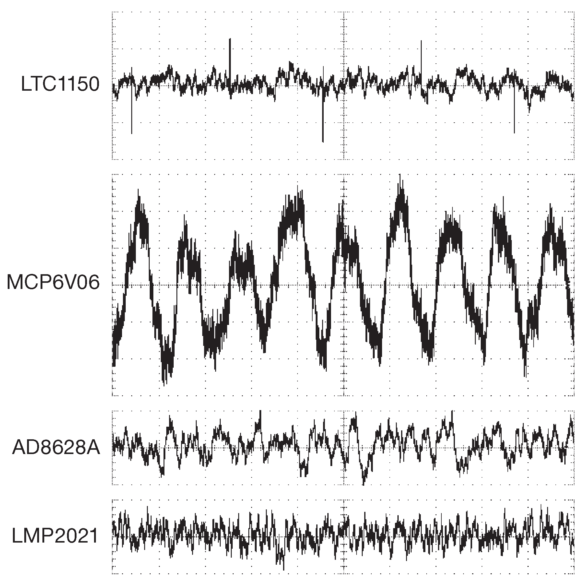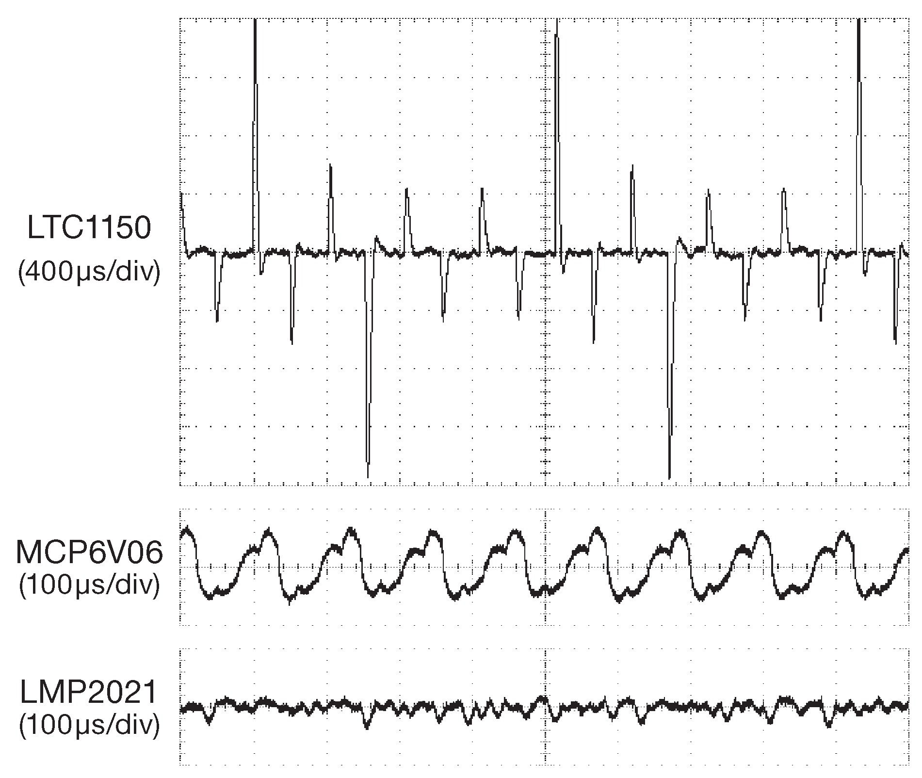 49 Судя по графикам, уровни токовых наводок составляют для LTC1150 8 nApp , а для MCP6V06 - 1 nApp ( а паспортные цифры просто отличные: 0.6 fA/\(\sqrt{Hz}\) на 10 Hz ) и 0.2 nApp «грохот» у LMP2021, щеголяющего токовым шумом 0.35 pA/\(\sqrt{Hz}\). <-