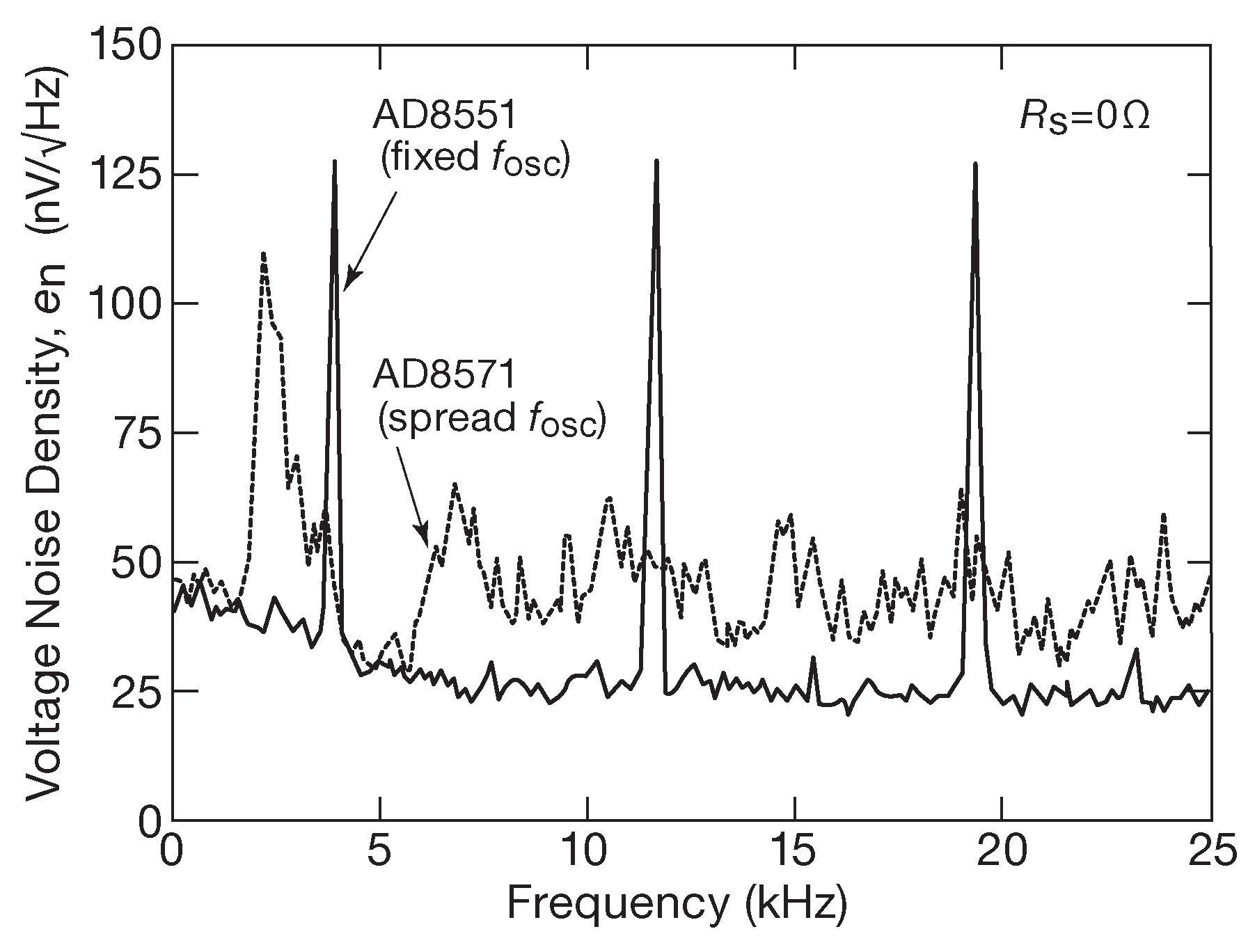 Рис.5.51 Спектры напряжения шума, взятые из справочных данных на два ОУ с автоподстройкой нуля. AD8571 меняет частоту генератора, чтобы снизить спектральные выбросы