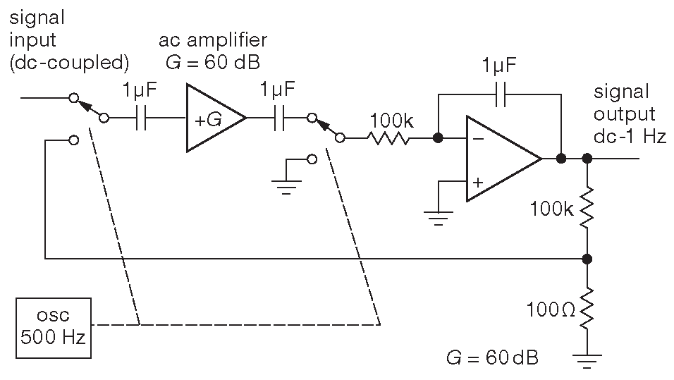 Занимаясь темой чопперов с автоподстройкой нуля следует отличать их от других «чопперов» - низкочастотных схемотехнических решений, в которых небольшой постоянный уровень преобразуется в переменный ( «chopped» - нарезанный ) определённой частоты, проходит через усилитель со связью по переменному току и, наконец, преобразуется обратно в постоянное, но уже усиленное, напряжение ( рис. 5.55 ). Эта техника называется «синхронным усилением» и сильно отличается от обсуждавшейся здесь [* см. §8.14 ] . Она работает только для сигналов, имеющих частоту ниже частоты тактирования, т.е. не более нескольких сотен герц. Такой способ усиления можно встретить в самописцах и подобных им низкочастотных приборах.
