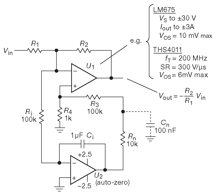 Низковольтовый усилитель автоподстройки \(U_2\) включён по схеме интегратора и наблюдает ошибку на инвертирующем входе основного усилителя \(U_1\) . Выход интегратора ослабляется в 100 раз, чтобы в нужной пропорции подстроить потенциал прямого вывода. С указанными номиналами выход интегратора меняется со скоростью \( dV/dt=-Δ V/( R_iC_i) \) , т.е. ошибка 10 μV приводит к изменению сигнала на выходе интегратора со скоростью –100 μV/s и корректирующему сигналу –1 μV/s на неинвертирующем входе \(U_1\) . Большая постоянная времени одновременно желательна ( дрейф ОУ - очень медленный процесс) и необходима ( чтобы предотвратить колебания в цепи обратной связи ). Диапазон коррекции устанавливается отношением \(R_3/R_4\) , т.е. сигнал ±1V на выходе интегратора создаёт корректирующее напряжение ±10 mV . LM675 очень приятный мощный ОУ ( 3A выходной ток, питание ±30 V , с очень сложной областью безопасной работы и защитой от перегрева ), но его напряжение смещения ±10 mV . Схема уменьшает эту цифру в 1000 раз. Аналогично, THS4011 - быстрый ОУ ( \( f_T \)=2000 MHz , SR=300 V/μs ) с максимальным смещением ±6 mV . Дополнительный фильтр \(R_nC_n\) на выходе автоподстройки может потребоваться для подавления шума переключения в медленной цепи коррекции, когда схема используется для работы с малосигнальными и малошумящими компонентами, подобными THS4011 ( 7.5 nV/\(\sqrt{Hz}\) ). Приведённую схему можно рассматривать как реализацию интегрального решения с рис. 5.41 на дискретных компонентах.