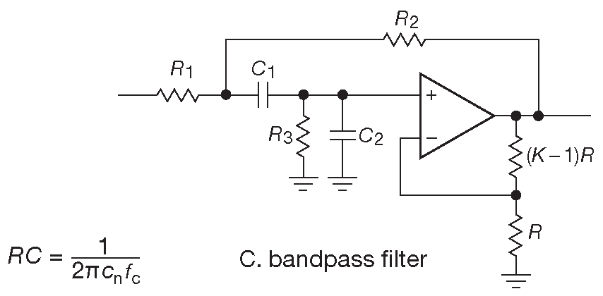 Источники напряжения, управляемые напряжением ( VCVS ) или фильтры с контролируемым источником , были изобретены Салленом и Ки ( в книге они появились в §6.2.4.E [* на самом деле в §4.3.6 ] ). Это вариант простого устройства с единичным усилением, показанного ранее на рис. 6.16 . В VCVS повторитель заменяется неинвертирующим каскадом с отличным от единицы усилением. На рис. 6.28 показаны варианты для ФНЧ, ФВЧ и полосового фильтра. Резисторы на выходе ОУ служат для задания усиления K , а остальные элементы отвечают за АЧХ схемы. На рисунке изображены 2-полюсные фильтры, которые могут быть и фильтрами Баттерворта, и Бесселя, и др. Тип зависит только от номиналов компонентов, что будет показано далее. Для получения фильтров более высокого порядка можно каскадировать любое число 2-полюсных секций VCVS, причём все секции общего набора будут различаться между собой. Каждая получит собственный квадратичный коэффициент полинома n-ного порядка, описывающего требуемый фильтр.