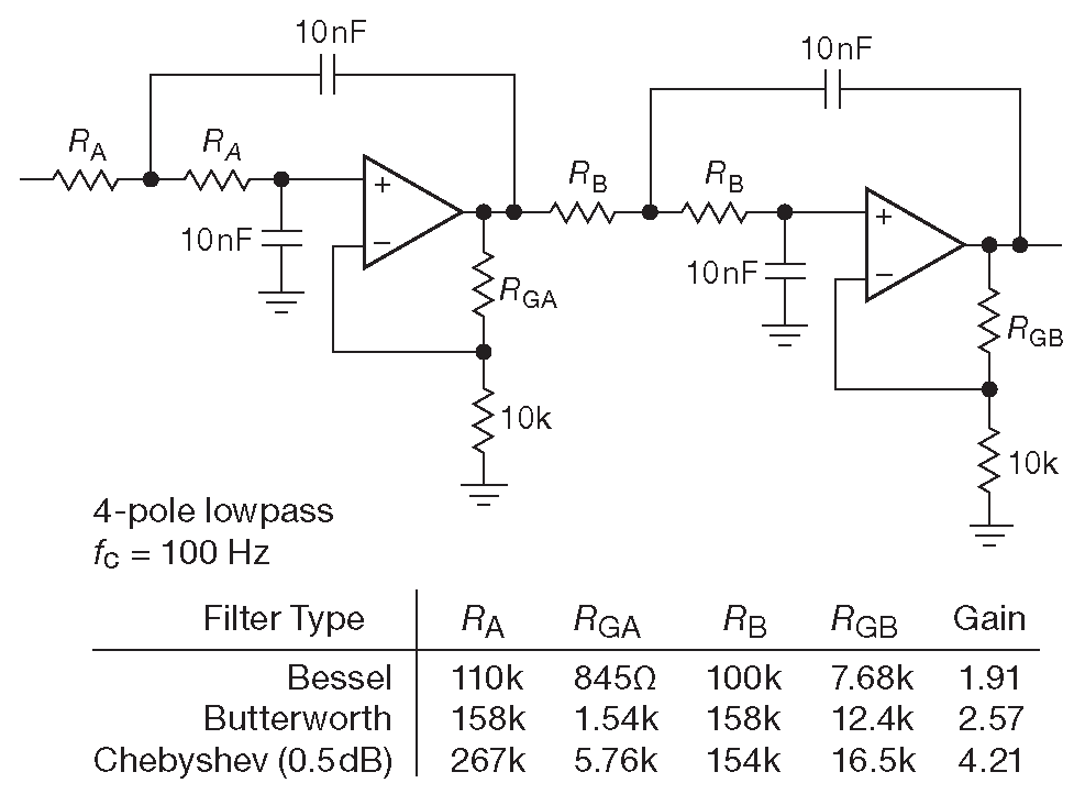 В качестве иллюстрации на рис. 6.29 показан VCVS фильтр 4-го порядка с \( f_c\)=100 Hz . В таблице перечислены номиналы резисторов для трёх типов фильтров, рассчитанные по приведённой методике. Аналогичный фильтр Баттерворта 6-го порядка с \( f_c\)=90 Hz использовался для создания синусоидального напряжения из прямоугольного сигнала, полученного от кварцевого генератора. Выходное синусоидальное напряжение шло на привод телескопа 26 .