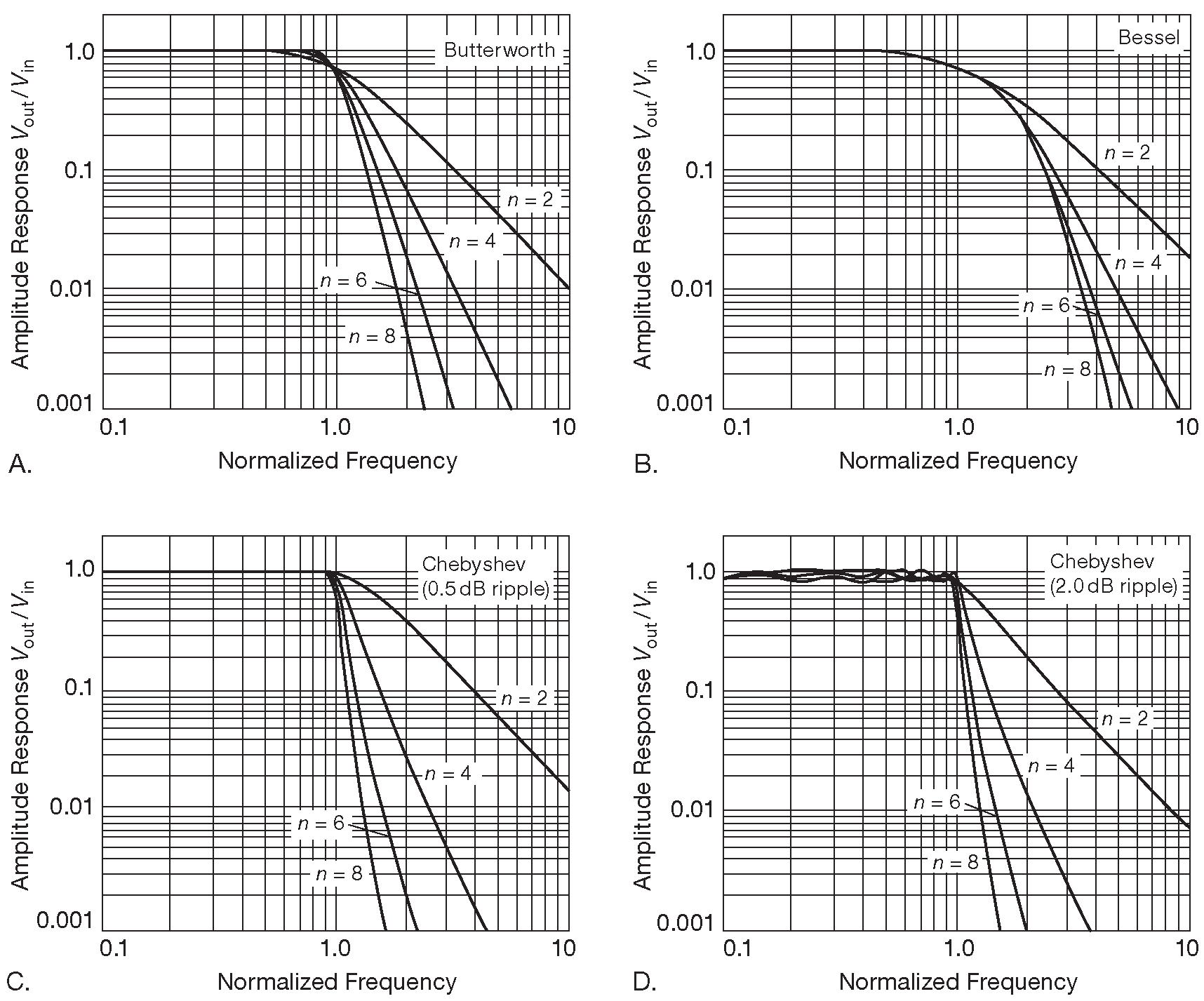 Для начала надо понять, что именно предполагается получить в итоге. Как говорилось ранее, «Баттерворт» следует рассматривать, если требуется максимально плоская АЧХ в рабочей полосе, «Чебышев» даёт самый резкий переход к заграждению ( ценой увеличения пульсаций в полосе пропускания ), а «Бессель» имеет наилучшие фазовые характеристики, т.е. постоянное время задержки в полосе пропускания и, соответственно, хорошую реакцию на перепад. Частотные характеристики для каждого типа приводятся на рис. 6.30 .