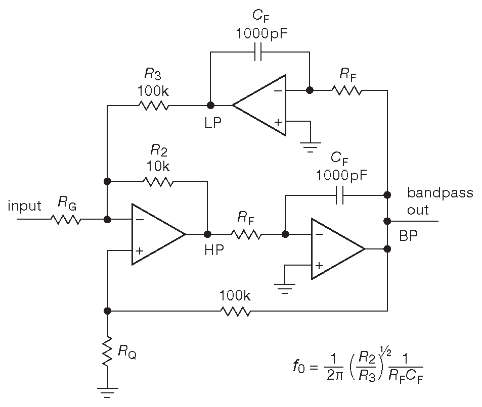 Фильтры с управляемыми параметрами с учётом их большого числа компонентов являются хорошим выбором для построения узкополосных ( высокодобротных ) полосовых фильтров. Такая архитектура имеет слабую чувствительность к компонентам, не предъявляет высоких требований к полосе ОУ и легко настраивается. Например, на схеме 6.31 изображён полосовой фильтр. Два резистора \(R_F\) выставляют центральную частоту, а \(R_Q\) и \(R_G\) вместе определяют добротность и усиление на центральной частоте \[ \begin{align} R_E &= \frac{5.03 ×10^7}{f_0} \qquad &Ω, \qquad &[6.8]\\ R_Q &= \frac{10\space^5}{3.48Q + G — 1} \qquad &Ω, \qquad &[6.9]\\ R_G &= \frac{3.16Q ×10\space^4}{G} \qquad &Ω. \qquad &[6.10] \end{align} \]
