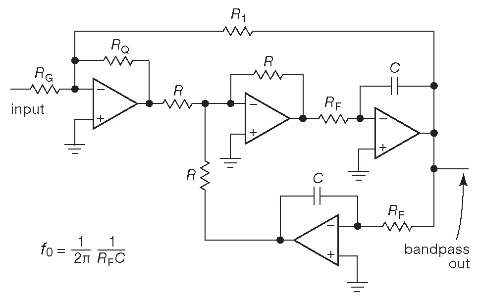 На рис. 6.32 показана удобная версия полосового фильтра. К сожалению, она требует четырёх ОУ, зато позволяет подстраивать ширину полосы ( т.е. добротность ) независимо от уровня усиления на центральной частоте. Оба параметра выставляются индивидуальными одиночными резисторами. Добротность, усиление и центральная частота становятся совершенно независимыми и рассчитываются по следующим уравнениям \[ \begin{align} f_0 &= \frac{1}{2πR_FC} , &[6.11] \\ Q &= \frac{R_1}{R_Q} , &[6.12] \\ G &= \frac{R_1}{R_G} , &[6.13] \\ R &≈ 10 kΩ . &[6.14] \end{align} \]