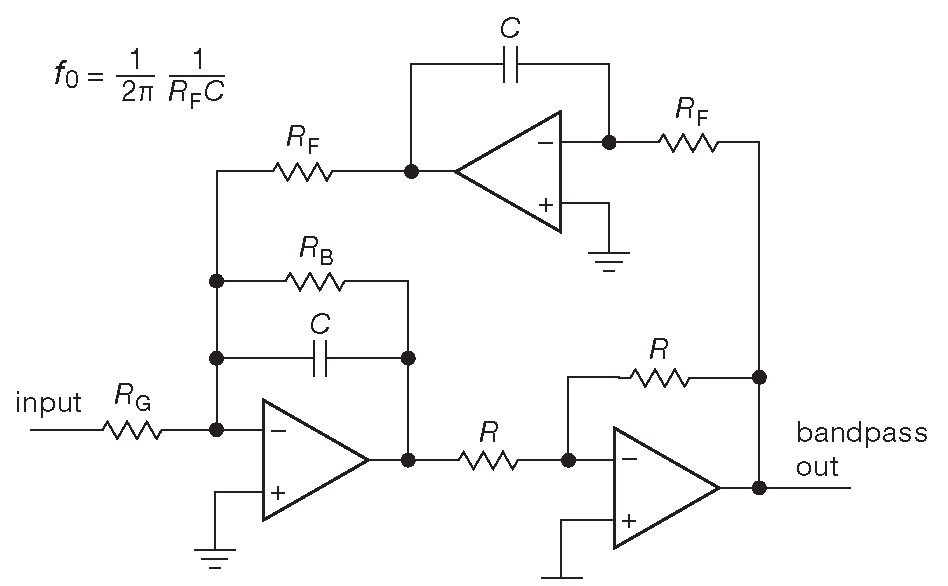 Очень похож на фильтр с управляемыми параметрами биквадратный фильтр ( рис. 6.33 ). Схема также состоит из трёх ОУ и может быть пересобрана из фильтра с управляемыми параметрами. У неё есть интересная особенность: частоту настройки можно менять ( резистором \(R_F\) ) , не изменяя при этом ширину полосы ( вместо неизменной добротности ). Вот расчётные уравнения \[ \begin{align} f_0 &= \frac{1}{2πR_FC}, &[6.15] \\ BW &= \frac{1}{2πR_BC}, &[6.16] \\ G &= \frac{R_B}{R_G}. &[6.17] \\ \end{align} \]