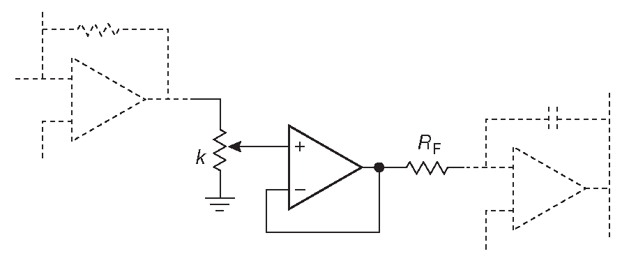 Рис. 6.32 Фильтр с независимой установкой усиления и добротности. Примечание. \(R\) - два согласованных резистора