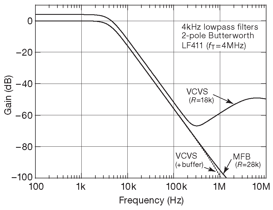 MFB имеет интересное преимущество перед VCVS: по мере приближения рабочей частоты фильтра к \( f_T \) используемого ОУ, рост выходного импеданса последнего меньше портит параметры схемы. Моделирование в SPICE работы VCVS и MFB фильтров низкой частоты Баттерворта 2-го порядка отлично выявляет данный эффект ( рис. 6.36 и 6.37 ). Была установлена частота среза 4 kHz , т.е. гораздо ниже \( f_T \) LF411 ( 4 MHz ). В VCVS варианте рост \(Z_{out}\) усилителя позволяет входному сигналу пролезать на выход через первый конденсатор, а в MFB этот путь отсутствует 34 . Эффект не особо серьёзный и снижается по мере увеличения номиналов резисторов, как видно на рис. 6.36 . Этот недостаток не мешает VCVS жить, работать и оставаться по-прежнему популярным 35 .