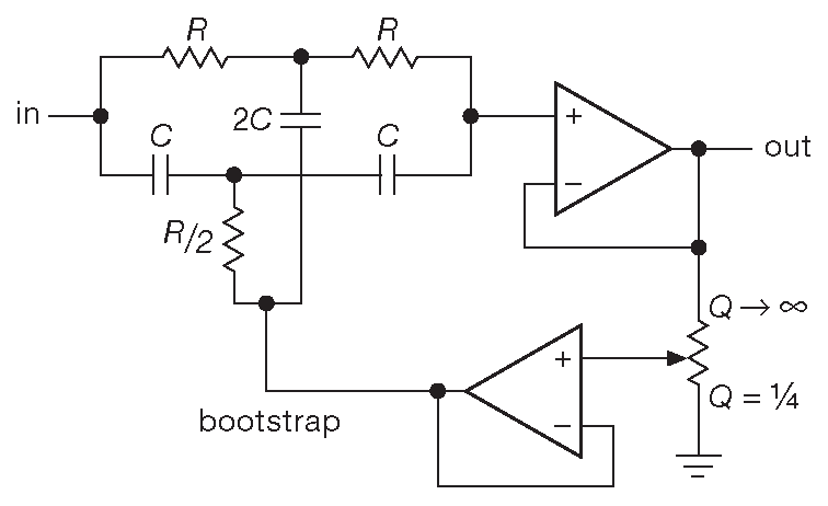 Так же, как и в случае пассивной цепи «двойное-T», данный фильтр ( известный как мостовой дифференциатор ) имеет плавный спуск кривой подавления вне частоты заграждения и бесконечное подавление ( предполагается хорошее согласование величин компонентов ) на частоте заграждения. Его тоже можно «активировать», добавив в движок переменного резистора вольтодобавку, как на рис. 6.39 , с коэффициентом усиления чуть менее единицы. Приближение усиления к единице делает пик на графике подавления Уже, но одновременно вызывает появление на АЧХ неприятного выброса выше частоты заграждения и уменьшает общую величину подавления.
