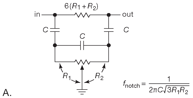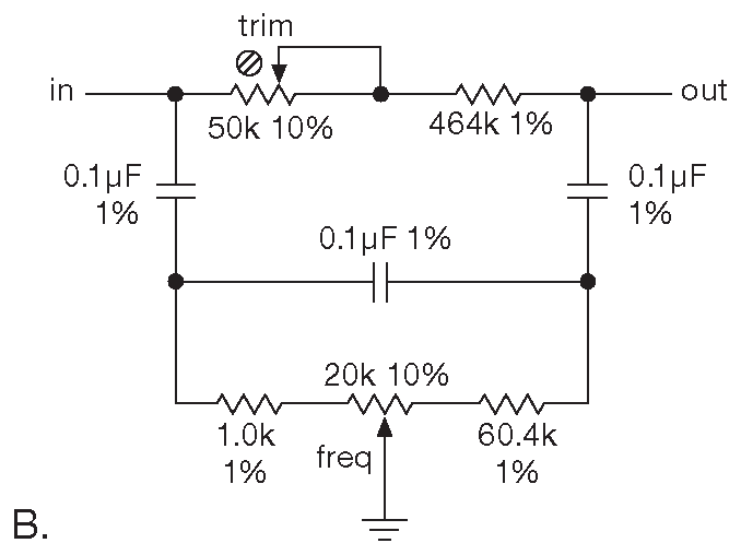 Схемы «двойное-T» хорошо работают в качестве фильтров-пробок на фиксированную частоту, но попытка добавить в схему подстройку - это совершеннейший ужас, потому что для поддержания постоянства подавления три резистора должны подстраиваться одновременно. Зато есть очень простая RC цепь ( рис. 6.40A ), работающая подобно «двойному-T», но поддающаяся подстройке в широком диапазоне частот ( минимум две октавы ) одним потенциометром. Подобно «двойному-T» ( и большей части активных фильтров ) схема требует согласования компонентов. В данном случае требуется 3 идентичных конденсатора, а постоянный резистор должен быть точно в 6 раз больше, чем сопротивление потенциометра. Частота заграждения находится по формуле: \[ f_{notch}=\frac{1}{2πC\sqrt{3R_1R_2}}. \]