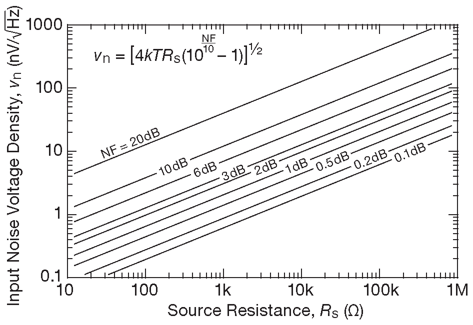 где \(v_s\) - среднеквадратическое значение амплитуды сигнала, \(R_S\) – импеданс источника, NF - коэффициент шума усилителя для источника с сопротивлением \(R_S\) . Примеры расчёта можно посмотреть в §8.3.1 и §8.5.6 .
