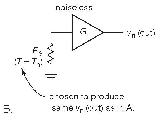 Что такое температура шума можно понять из рис. 8.8 . Для начала надо представить реальный (шумящий ) усилитель, подключённый к идеальному ( не шумящему ) источнику сигнала с импедансом \(R_S\) ( рис. 8.8 A ). В качестве такого источника можно взять резистор с сопротивлением \(R_S\) , охлаждённый до абсолютного нуля. На выходе схемы будет присутствовать какой-то шум, целиком определяемый шумом усилителя. Теперь возьмём вторую схему ( рис. 8.8B ) из бесшумного усилителя и сопротивления \(R_S\) , нагретого до некоей температуры \( T_n\) , при которой напряжение шума схемы 8.8B равно напряжению шума схемы 8.8 A . Полученная температура \( T_n\) называется температурой шума усилителя для источника сигнала с импедансом \(R_S\) .