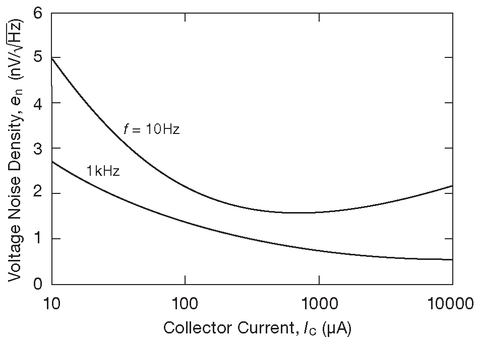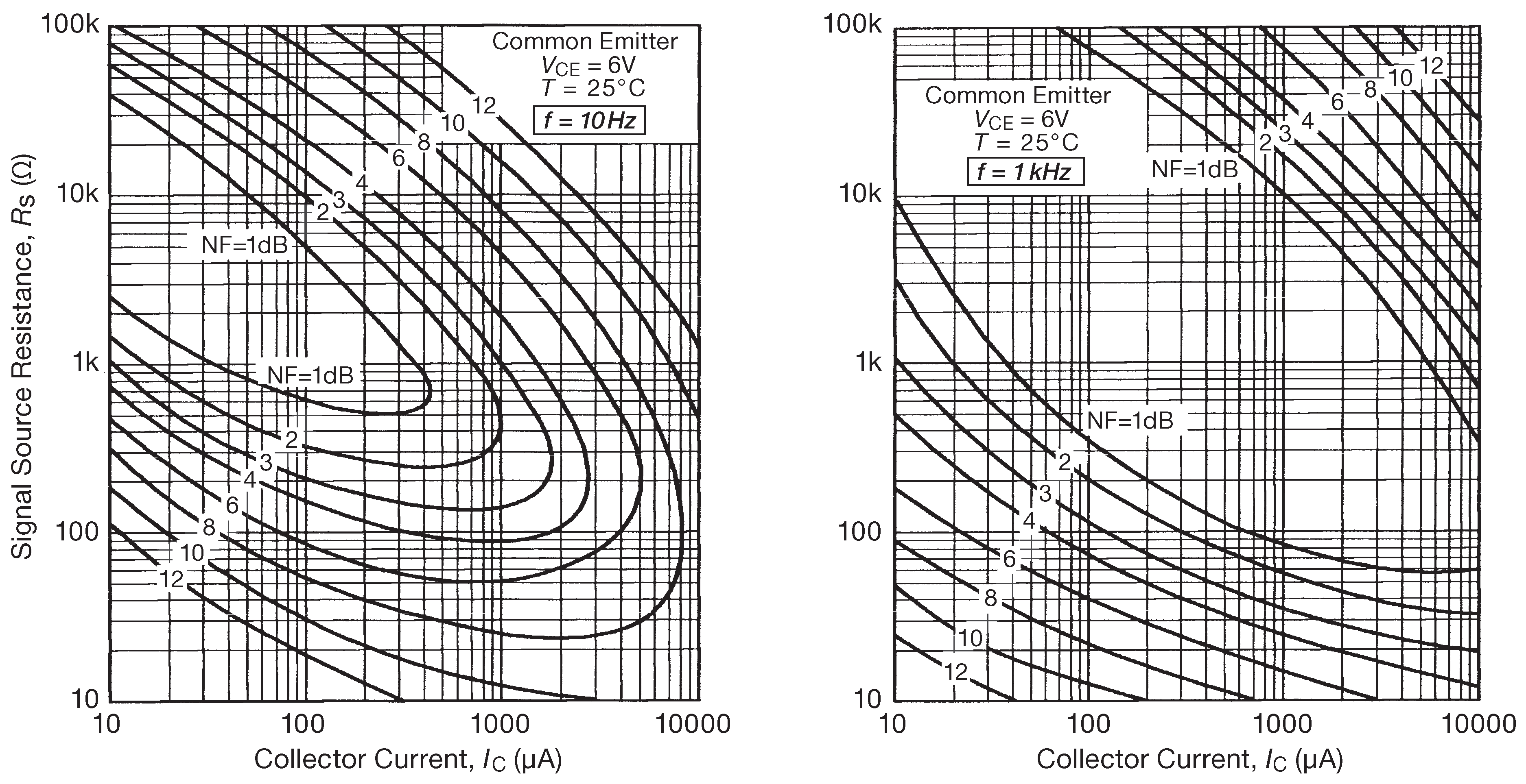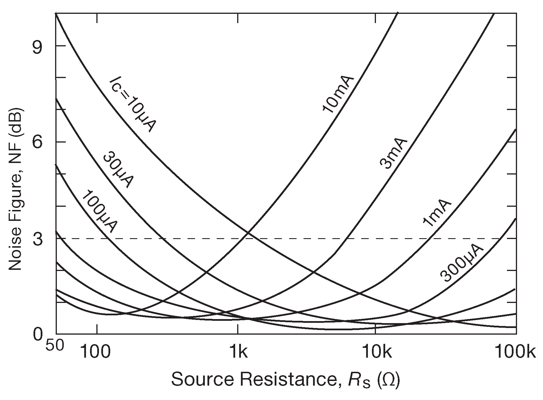 Перед тем, как двигаться дальше, рассмотрим эти графики ещё раз. Для малых величин \(R_S\) напряжение теплового шума источника невелико - немного меньше, чем входное напряжение шума \(e_n\) при малых токах коллектора 31 . Например, для \(R_S\) =100 Ω величина составит \(e_n\) =1.3 nV/\(\sqrt{Hz}\) . Именно поэтому коэффициент шума улучшается с увеличением тока коллектора. С другой стороны, для больших величин \(R_S\) напряжение шума транзистора совершенно незначительно в сравнении с тепловым шумом резистора. Зато при работе с приличными токами коллектора входной токовый шум транзистора ( дробовый шум тока базы \(i_n≈\sqrt{2qI_B}\) ) создаёт столь большое падение напряжения на \(R_S\) , что оно становится гораздо заметнее, чем тепловой шум того же \(R_S\) . Именно поэтому графики коэффициента шума проходят выше ( значения не так хороши ).