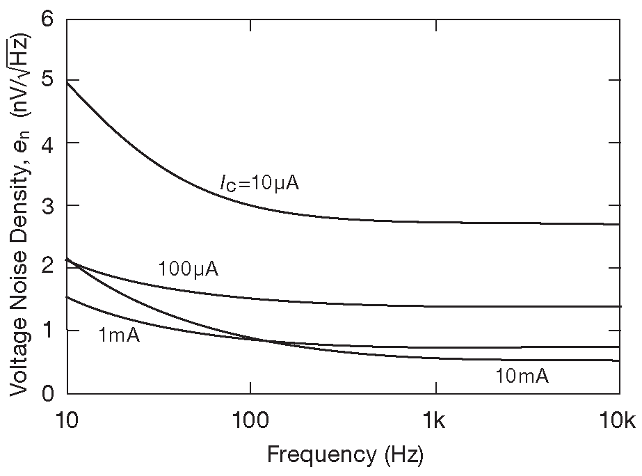 Так как частота точек перегиба зависит от тока коллектора, значения \(e_{nL}\) и \(e_{nH}\) берутся из графика 8.25 для каждой из четырёх декад величины \(I_C\) , после чего строится зависимость \(e_n\) от частоты. Итоговый спектр напряжения шумов можно увидеть на рис. 8.26 .