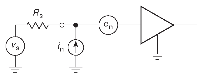 Тот факт, что \(e_n\) снижается, а \(i_n\) увеличивается по мере роста \(I_C\) , открывает простой способ оптимизации рабочего тока по минимуму шума при заданном импедансе источника. Вновь обратимся к модели ( рис. 8.28 ). Бесшумный источник сигнала \(v_s\) включается последовательно с неустранимой ЭДС теплового шума собственного сопротивления: \[ e_{R_S}^2=4kTR_S \qquad (\mathrm{V^2/Hz}). \qquad [8.29] \]