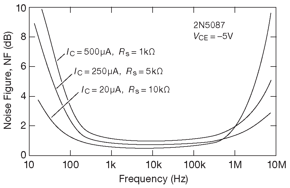 В качестве примера возьмём небольшой источник сигнала частотой 1 kHz с сопротивлением 10 kΩ , и попробуем сделать малошумящий усилитель с общим эмиттером на 2N5087. По графикам \(e_n\) и \(i_n\) из паспортных данных ( рис. 8.29 ) видно, что сумма компонент шума минимальна при токе коллектора около 20...40 μA . Из-за того, что с уменьшением \(I_C\) токовая составляющая падает быстрее, чем растёт доля напряжения, хорошей идеей будет взять нижнее значение диапазона [* т.е. меньший по величине ток \(I_C\) ] , особенно, если работа на низких частотах не предусматривается ( \(i_n\) быстро растёт со снижением частоты ). Коэффициент шума на частоте 1 kHz , используя \(e_n\) и \(i_n\) , можно вычислить по формуле: \[ \mathrm{NF}=10\space\lg\left(1+\frac{e_n^2+(i_nR_S )^2}{4kTR_S}\right ) \mathrm{dB}. \qquad [8.31] \]