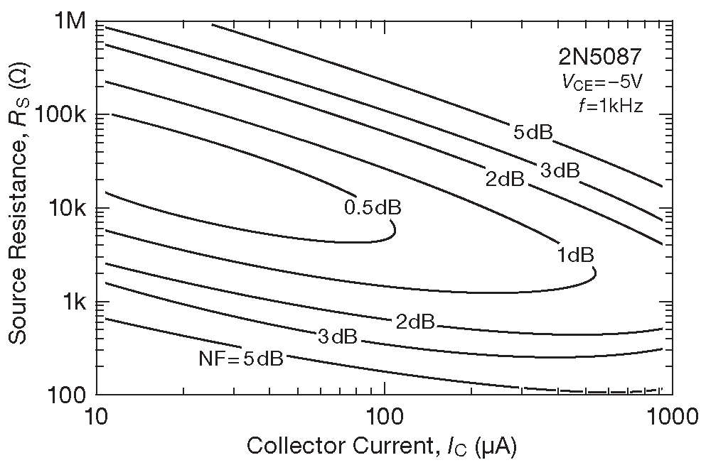 Шумовые параметры усилителей на биполярных транзисторах отлично подходят для источников с сопротивлением от 200 Ω до 1 MΩ . Оптимальные токи коллектора лежат в диапазоне от нескольких миллиампер и до единиц микроампер ( с низкими сопротивлениями желательно снижать \(e_n\) , а с высокими - \(i_n\) , что как было показано ранее, диктует выбор высокого или низкого рабочего тока соответственно ).