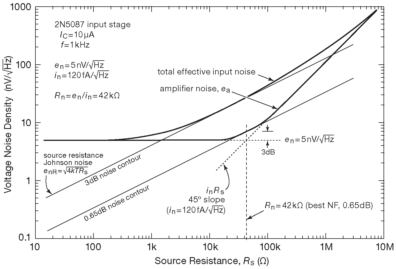 Во-первых, следует задаться некоторой частотой, необходимой для выбора нужного набора \(I_C\) , \(e_n\) и \(i_n\) в паспортных данных транзистора. Во-вторых, для заданного тока коллектора можно построить относящиеся к \(e_n\) и \(i_n\) доли в общем коэффициенте шума в виде их зависимости от сопротивления источника \(R_S\) . На что похож результат для pnp транзистора 2N5087 на частоте 1 kHz и токе коллектора 10 μA , можно увидеть на рис. 8.32 . Шумовое напряжение \(e_n\) постоянно, а произведение \(i_n·R_S\) растёт вместе с \(R_S\) , т.е. имеет график с наклоном 45° . Кривая шума усилителя проводится по этим двум направляющим через ( это важно ) точку, смещённую на 3 dB вверх ( отношение напряжений равно 1.4 ) точно над пересечением графиков обеих компонент шума. Кроме того, на график наносится линия, соответствующая напряжению теплового шума сопротивления источника сигнала, которая по совместительству исполняет роль контура NF=3 dB . Все остальные линии постоянных значений коэффициента шума параллельны линии NF=3 dB , как можно будет убедиться на примерах ниже.