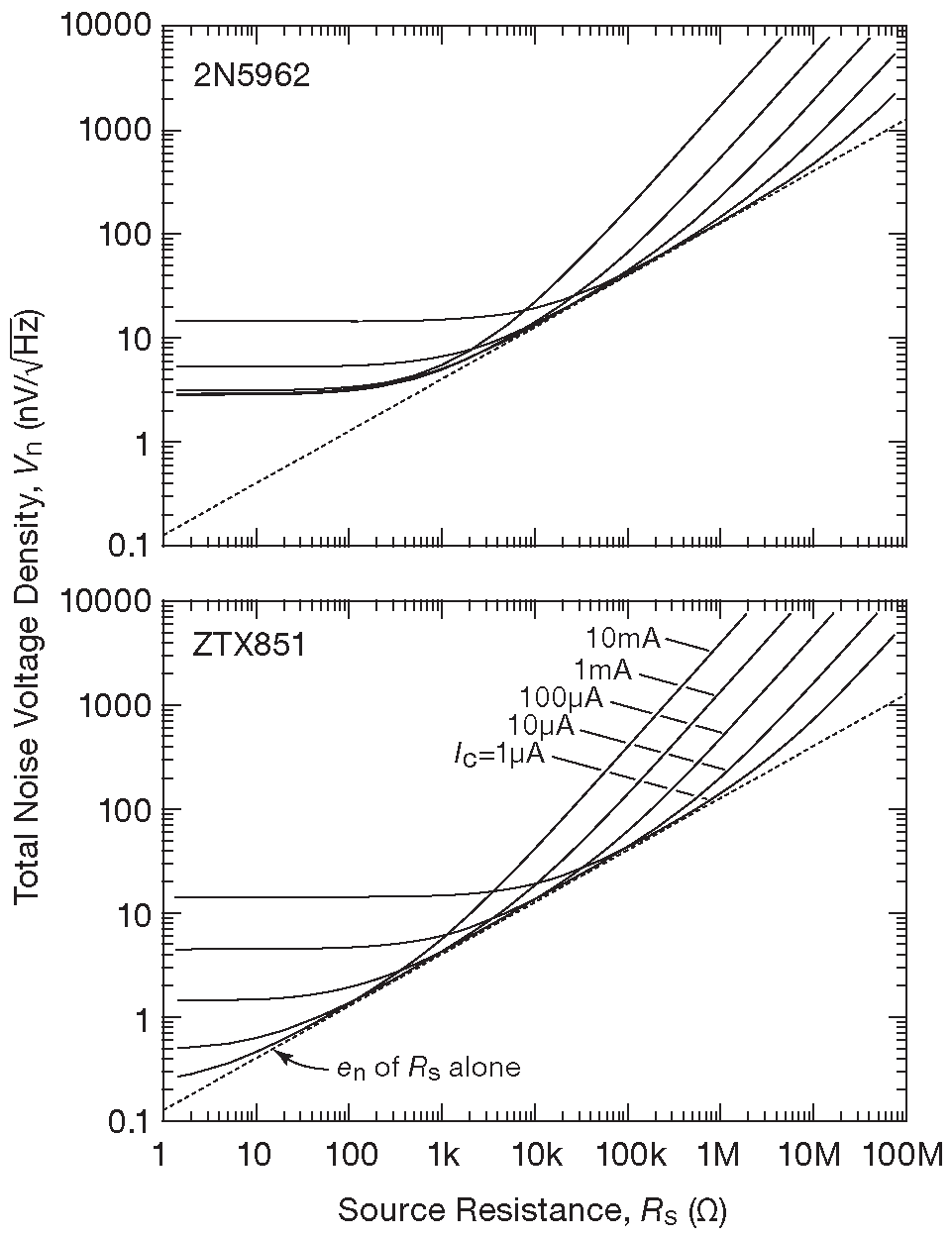 Рис.8.33 Сравнение шумов двух типов биполярных транзисторов. Графики перекрывают пять декад значений тока коллектора. За счёт низкого сопротивления \( r_{bb'}\) ZTX851 обеспечивает низкий уровень шума при высоких токах коллектора для источников сигнала с малым сопротивлением. 2N5962 с высоким значением \( r_{bb'}\) имеет чёткую нижнюю границу шумового напряжения. Зато его высокая бета ( и, соответственно, низкий дробовый шум тока базы \(\sqrt{2qI_C/β}\) ) даёт лучшие, чем у конкурента, результаты на источниках с большим сопротивлением. Для сравнения приводится тепловой шум сопротивления источника